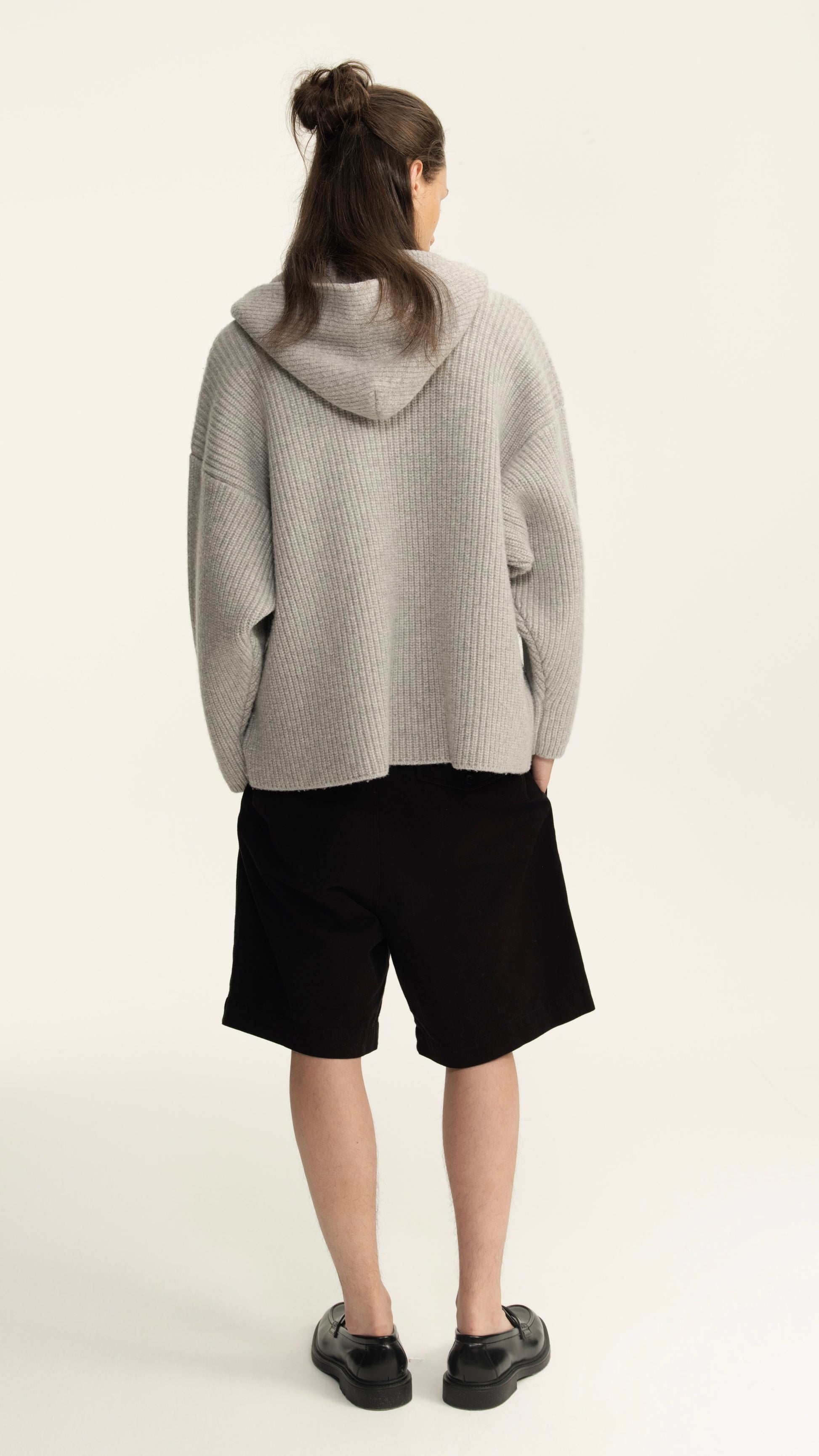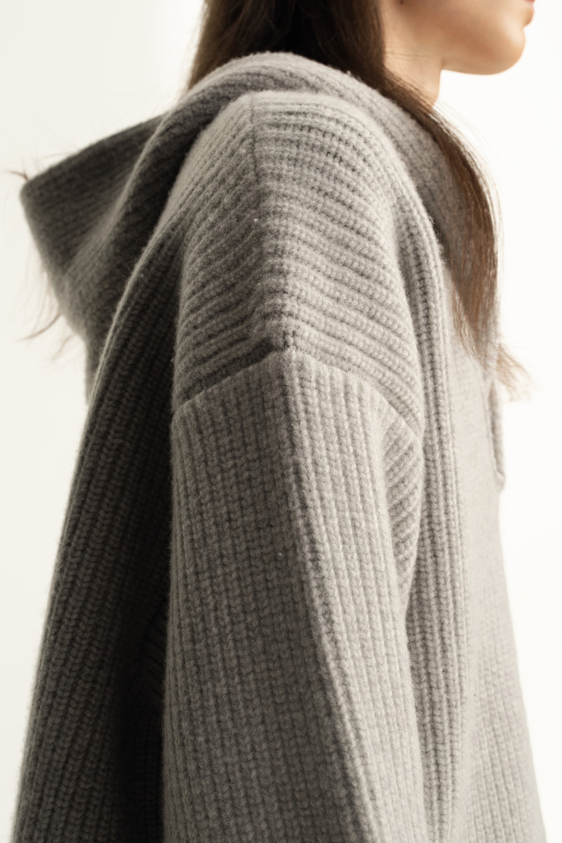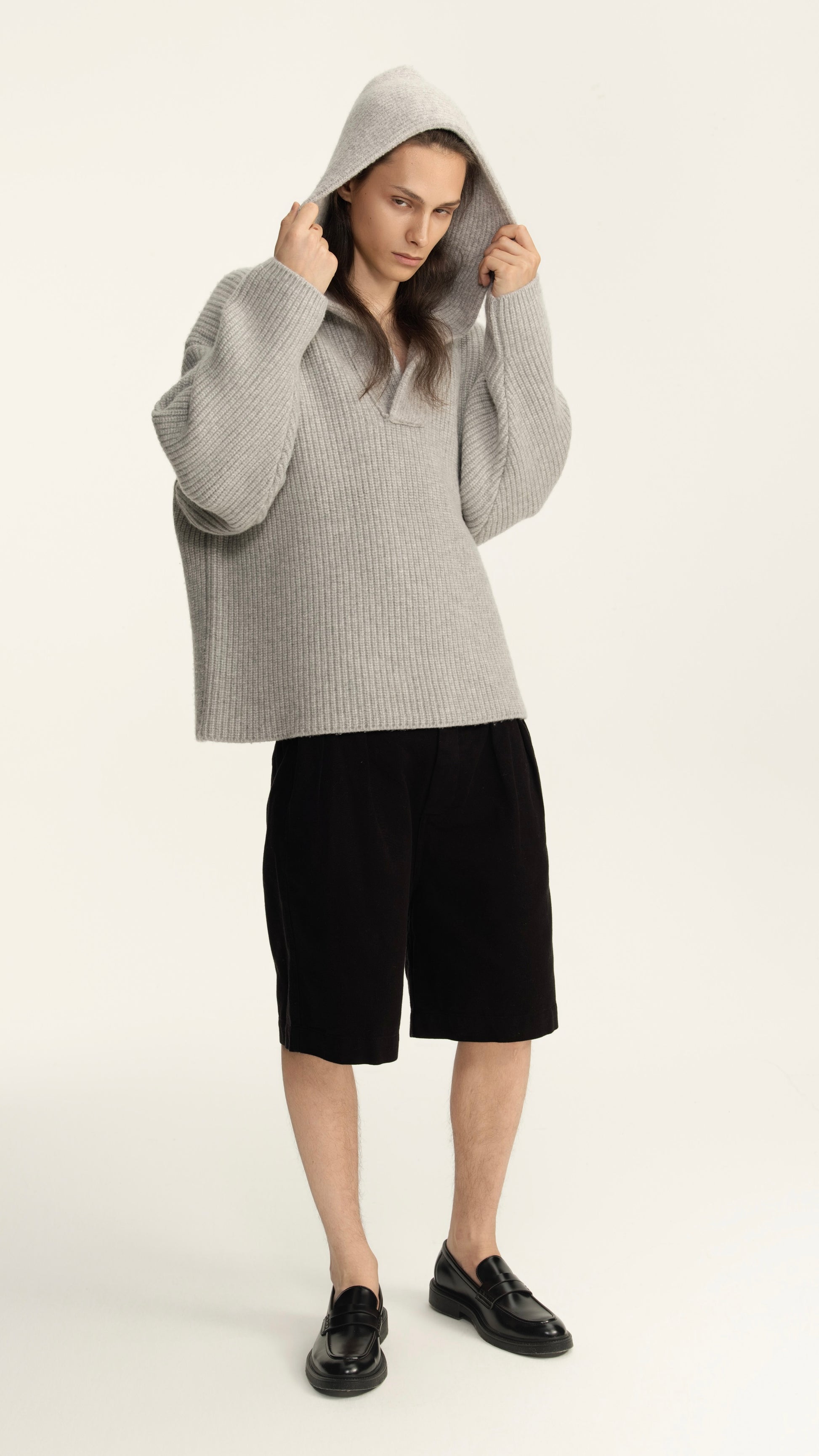 Discover a blend of modern comfort and effortless style with our Tadao Hoodie. Crafted from a soft, substantial ribbed knit in a sophisticated ash grey hue, this unique sweater features a distinctive deep V-neckline combined with an integrated hood, offering a contemporary take on a classic silhouette. The wide ribbing provides a rich tactile texture, while the relaxed fit ensures comfortable drape and easy wear. Perfect for elevated casual looks, urban explorations, or simply enjoying a relaxed day in refined style.