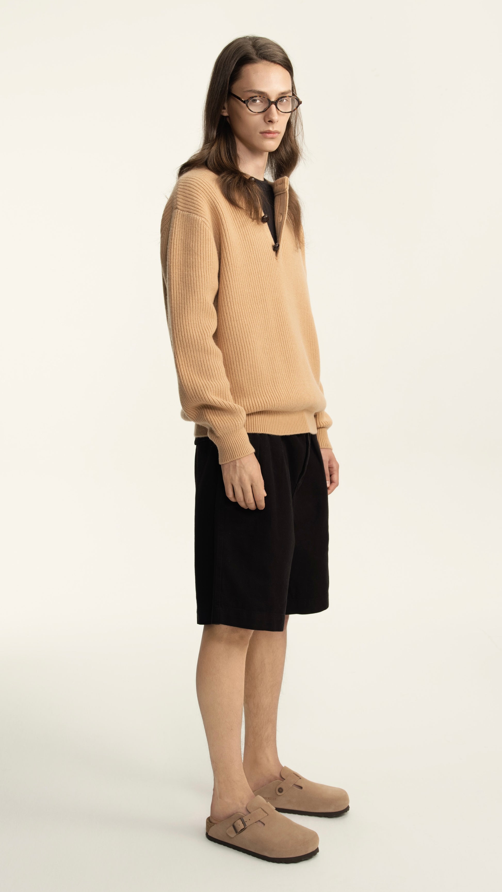 Embrace effortless comfort and sophisticated style with our Henley Sweater. Crafted from a soft, camel-hued ribbed knit, the sweater features a classic Henley neckline with button detailing, offering a versatile look that can be dressed up or down. Its relaxed fit ensures all-day comfort, while the ribbed texture adds a touch of refined detail.