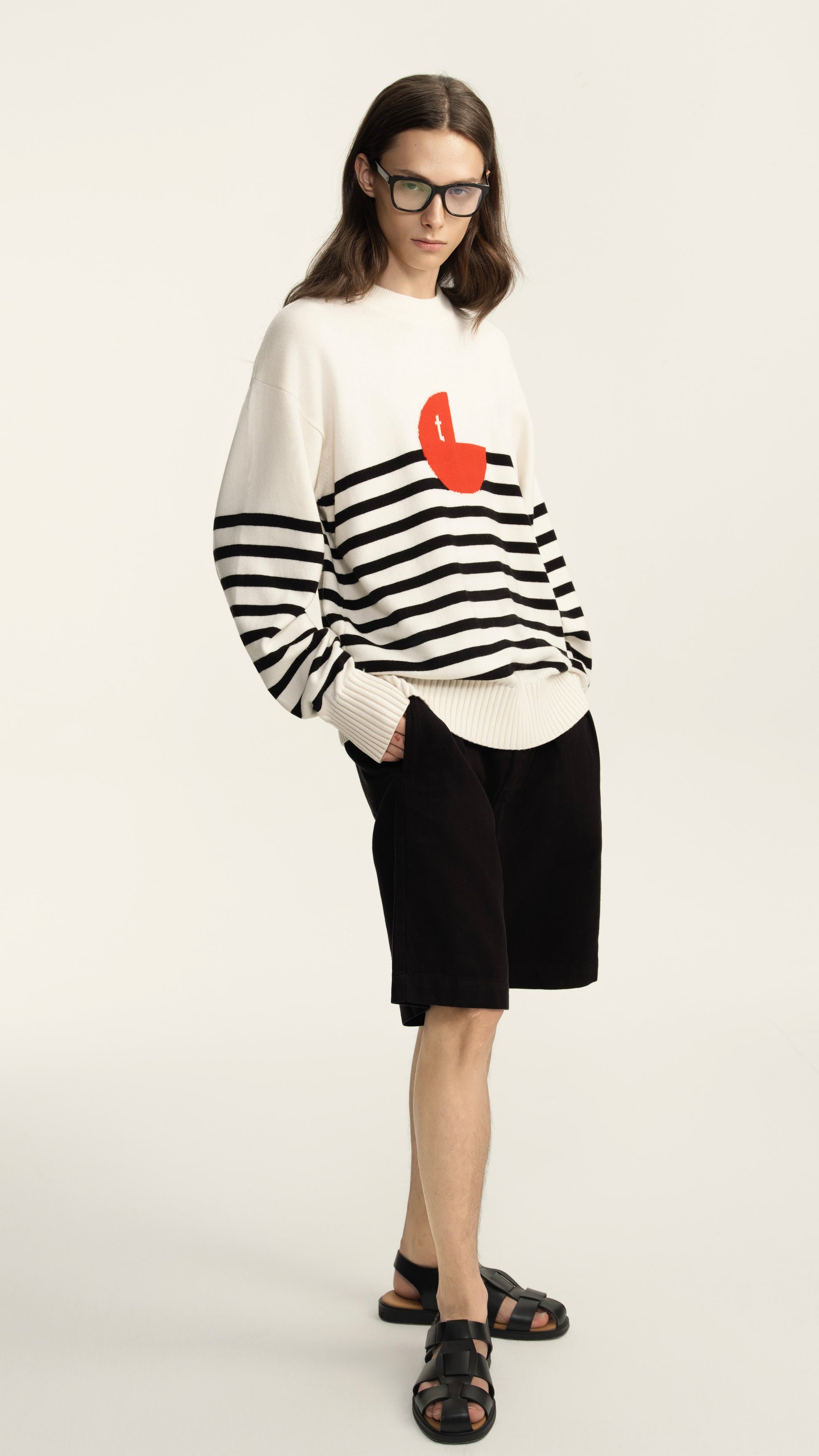 This marinière sweater reimagines the timeless striped pattern with a striking red abstract patch for a contemporary edge. Its oversized, drop-shoulder cut offers a comfortable, relaxed silhouette. Made from 100% wool, it provides softness, breathability, and warmth—ideal for layering throughout the year. Designed to complement all genders, this versatile piece pairs seamlessly with everything from tailored black shorts to classic denim.