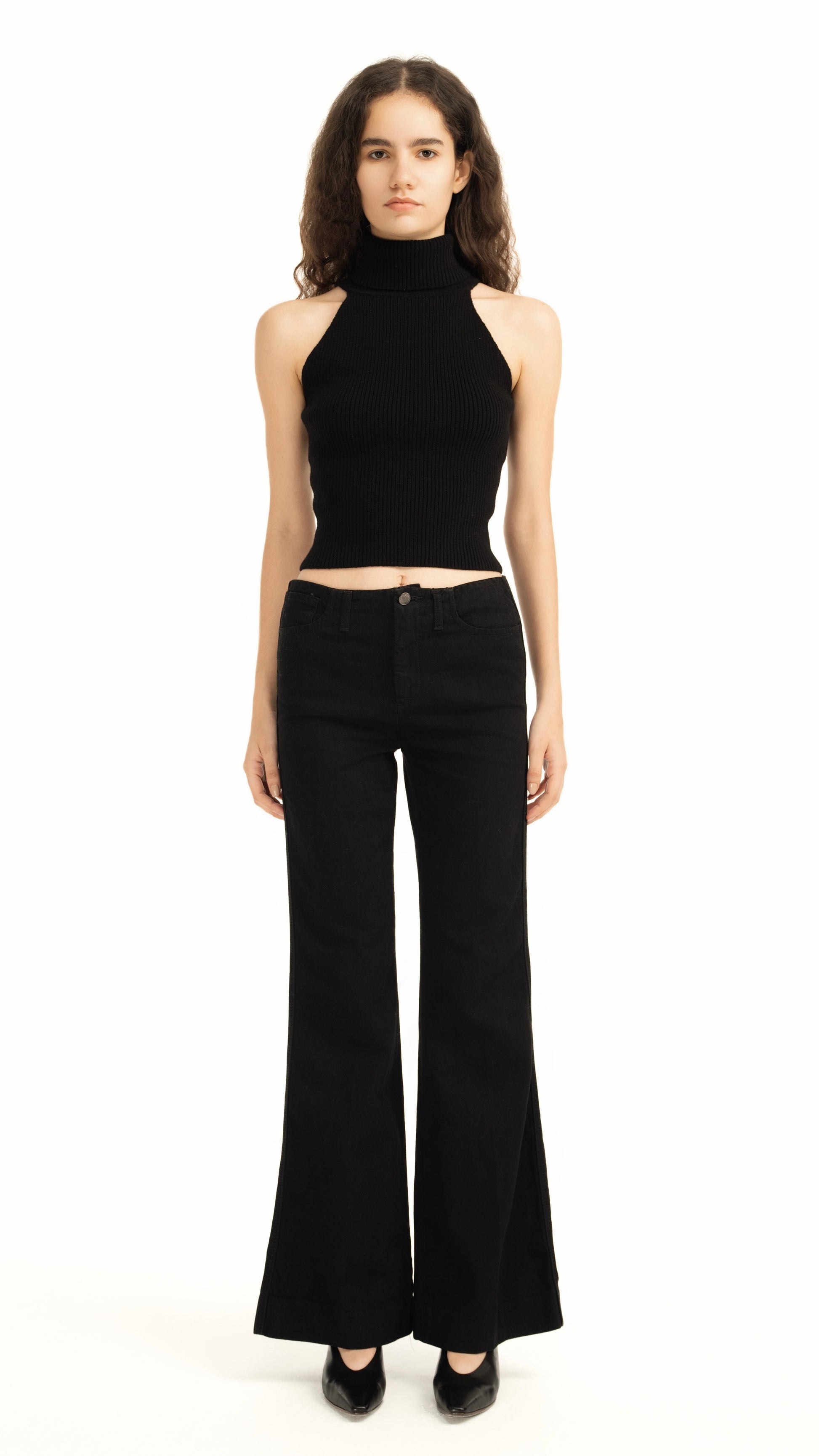 Achieve a chic and modern silhouette with our Ilsa Top. Crafted from a soft, stretch-ribbed knit in timeless black, this top offers both comfort and a flattering, body-hugging fit. The sophisticated turtleneck collar combined with a stylish sleeveless, halter-style cut creates a contemporary and elegant look. The prominent ribbed texture adds visual interest and enhances the top's sleek appeal. Perfect for layering under blazers or jackets, or wearing as a striking standalone piece, this versatile top is an essential for building a refined and modern wardrobe suitable for various occasions, from evening wear to elevated casual ensembles.